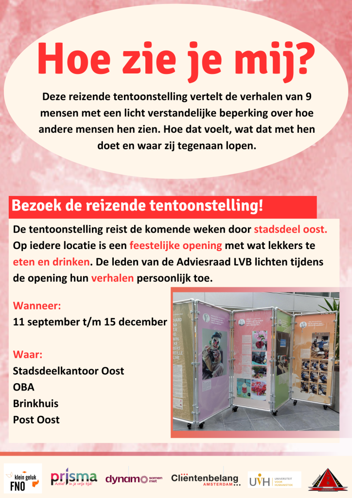 Dit is de website van de Adviesraad voor mensen met een licht verstandelijke beperking in Amsterdam Bezoek de tentoonstelling dit najaar op één van de vier locaties in Amsterdam-Oost. Of kom naar één van de openingen en hoor de verhalen persoonlijk. Wat is een licht verstandelijke beperking? De Adviesraad in actie op het Roots festival.